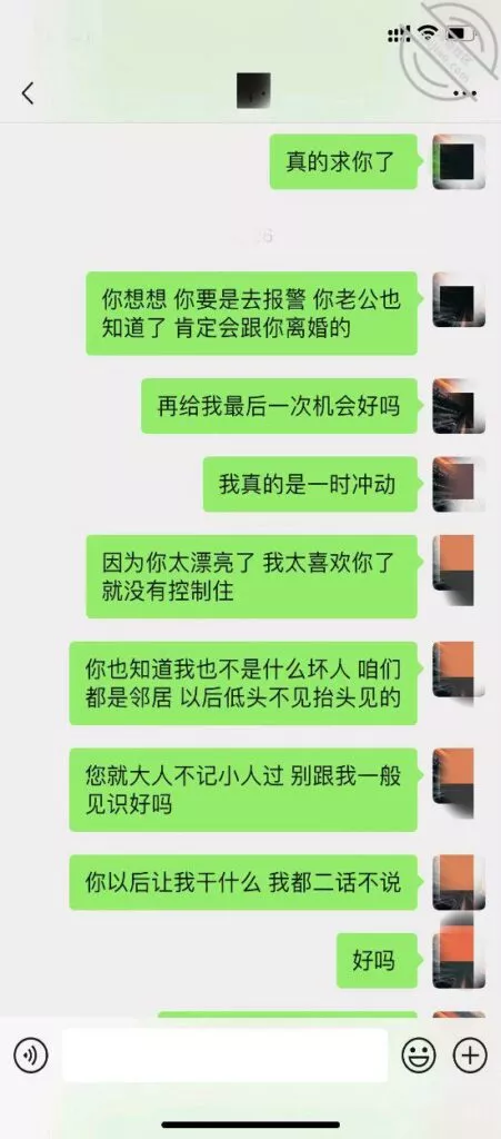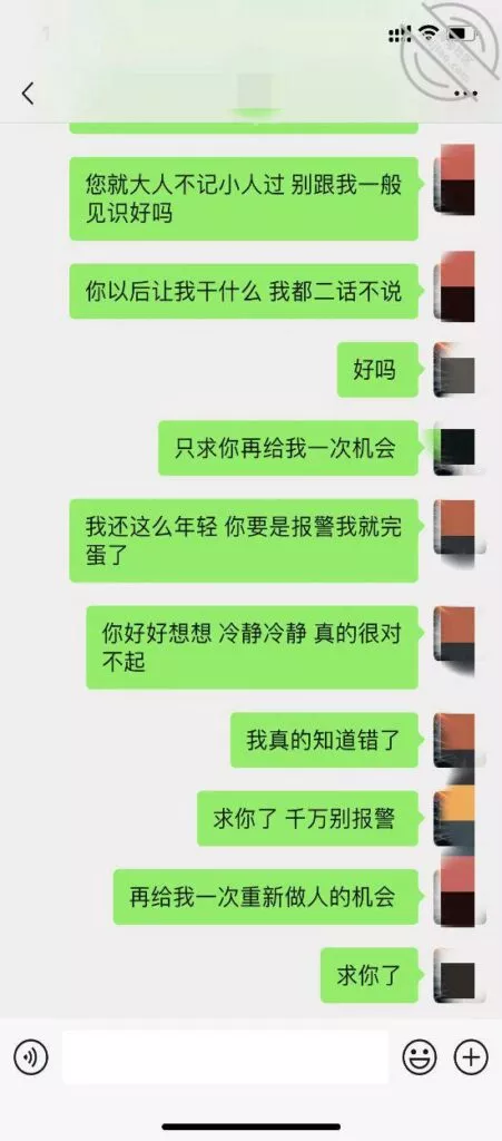 我回家就赶紧微信给她道歉,希望她当做没发生,能原谅我,谁知道她坚决要去报警,我不停的给她道歉认错,她就是不理我